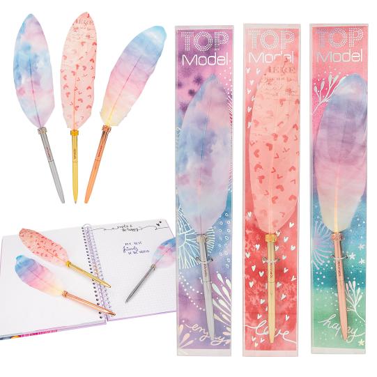 Disponibles tres diseños preciosos: cuerpo oro rosa y pluma arcoíris; cuerpo dorado y pluma de corazoncitos rosa; o bien cuerpo plata y pluma con suave degradado tie dye.